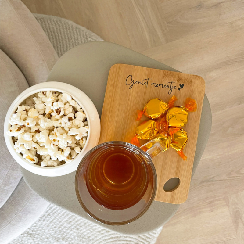 Maak elk borrelmoment extra bijzonder met deze sfeervolle serveerplank – Geniet Momentje. Een compact maar stijlvol plankje met een vrolijke boodschap die perfect past bij een gezellige avond met vrienden, familie of lekker met jezelf.